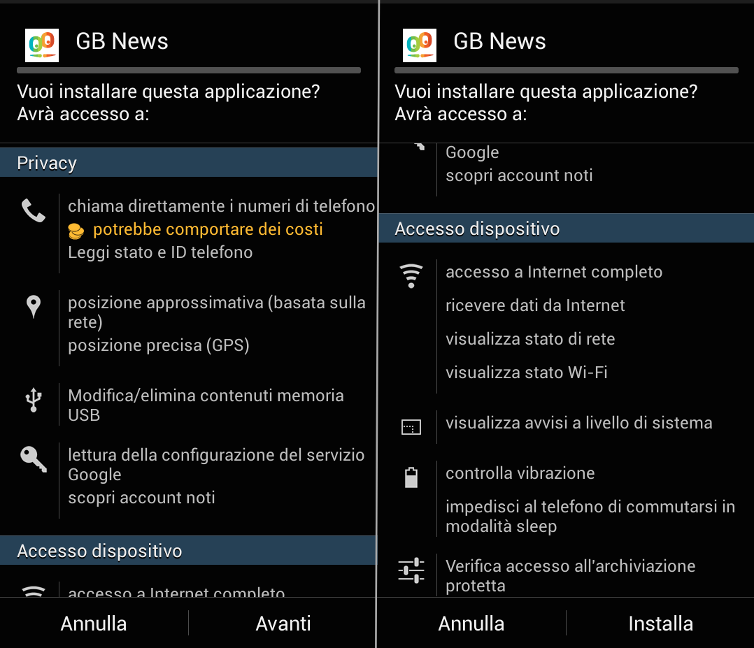 - Modifica/elimina contenuti memoria USB e Verifica accesso all'archiviazione protetta: questi permessi sembrano un po' sospetti ma tutto quello che dicono in realtà è che permettono all'app di salvare i contenuti nel dispositivo invece di prenderli da server esterni ogni volta che si apre l'app. Questo è importante per due motivi: permette all'app di funzionare molto più velocemente e di funzionare offline;