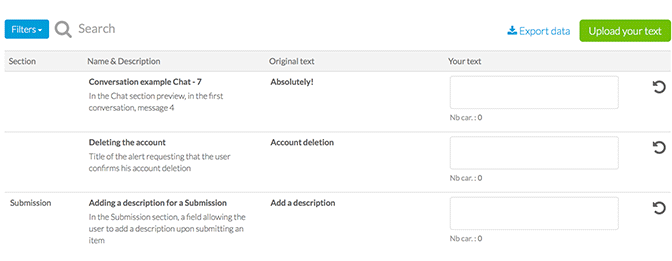 In questo menu potrai trovare un gran numero di testi compresi di descrizione. Per rendere la ricerca più rapida ed efficiente, i testi possono essere filtrati per sezione o parola chiave. Una volta identificato il testo che vuoi personalizzare, devi semplicemente inserire il nuovo testo nel relativo campo.
