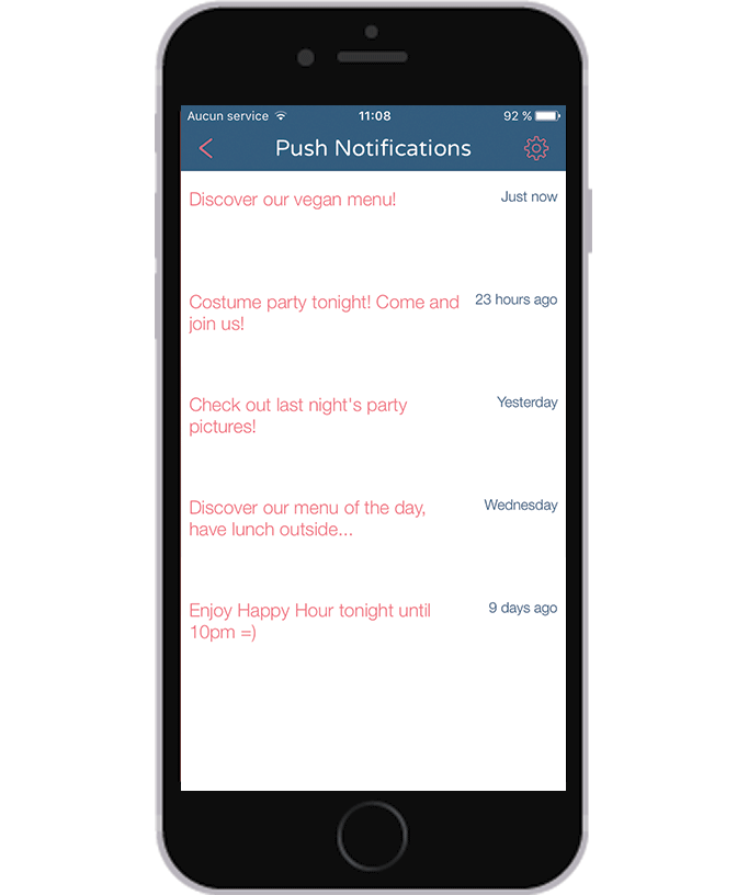 Le notifiche appariranno sotto forma di lista: tutte le push ricevute da quando l'utente utilizza l'applicazione. Chiaramente la cronologia é legata al dispositivo utilizzato. Se l'utente ha scaricato ad esempio la tua app sia sullo smartphone che sul tablet, le notifiche ricevute sul primo non appariranno nella cronologia del secondo e viceversa.