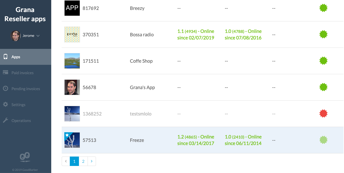La prima cosa che noterai nella reseller dashboard è che tutte le tue app sono elencate, così come il loro stato di pubblicazione su ogni piattaforma, iOS e Android. Da questa interfaccia, puoi creare nuove app, aggiungere app esistenti o rimuovere app dal tuo account. Puoi anche trasferire la proprietà di un'app (o anche di un'agenzia!), disabilitare temporaneamente un progetto, un'opzione utile in caso di problemi di fatturazione con un cliente, ad esempio.