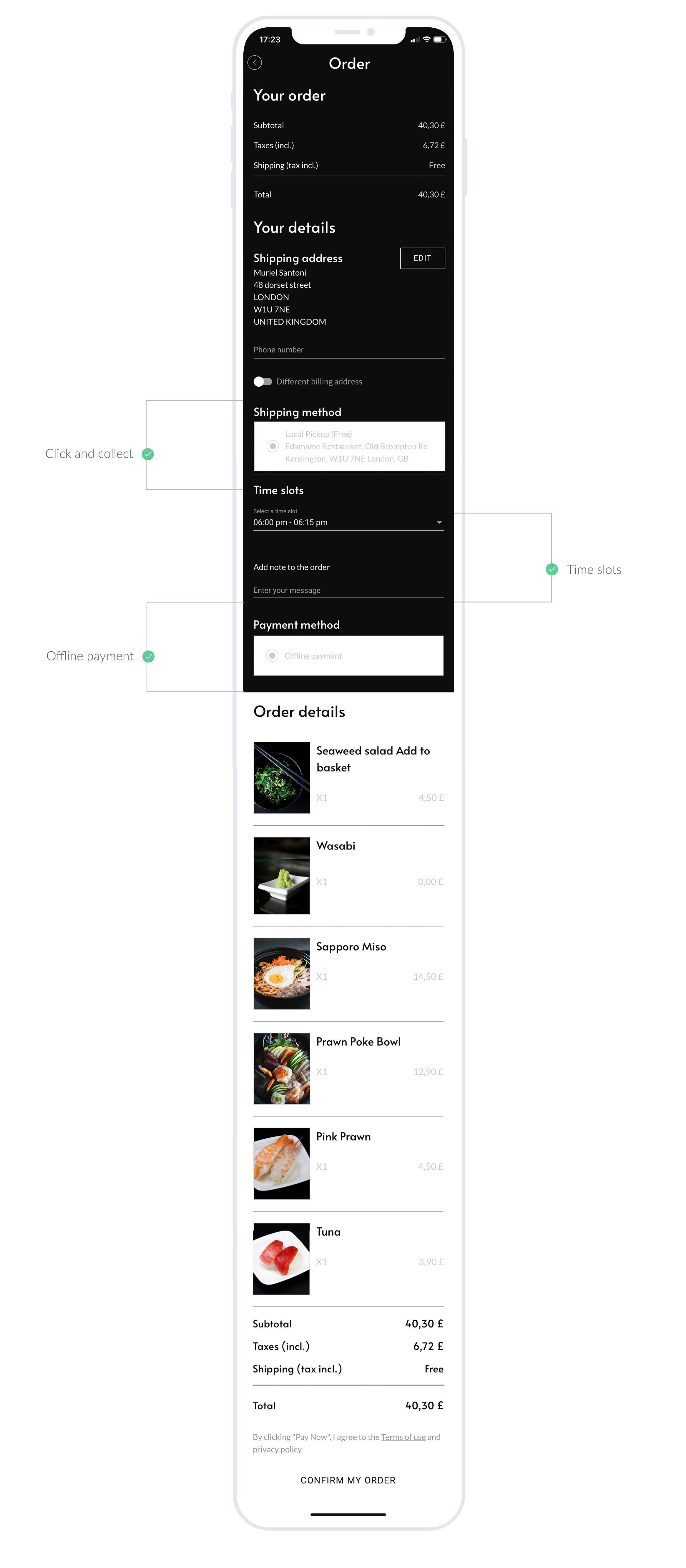 Per il pagamento, si segue la stessa logica: i proprietari dell'Edamame hanno deciso di offrire una sola opzione di pagamento: il pagamento offline. I clienti convalidano il loro ordine tramite l'app, ma pagheranno solo quando lo ritireranno direttamente in negozio. Nessun cambiamento nelle abitudini operative del ristorante.