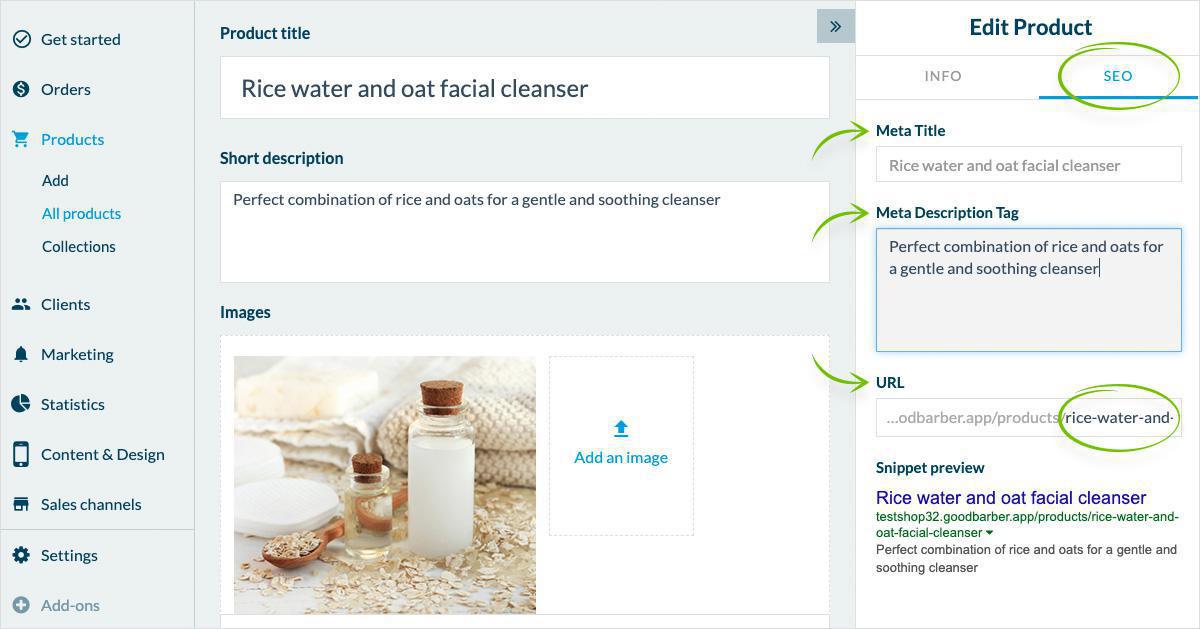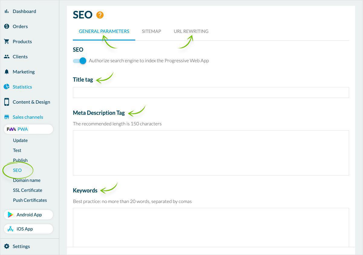 Esistono varie opzioni che ti offrono tutto ciò di cui hai bisogno per essere perfettamente indicizzato. Nel back office della tua app (Shopping o Classic) sarai in grado di personalizzare gli elementi chiave per il tuo SEO.