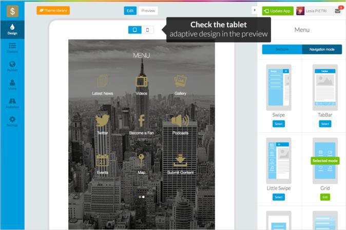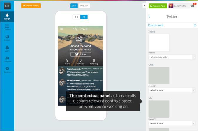 - A destra, in un pannello contestuale, trovate i comandi necessari per progettare il design dell'app.