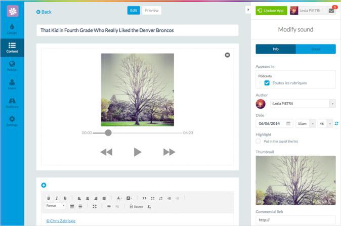 Molte persone saltano le forme tradizionali di presenza sul web per passare direttamente a quelle sul mobile; molti blogger hanno infatti una app per i proprio blog, e non più un sito web. Per questo motivo, non solo abbiamo migliorato l'interfaccia del CMS ma abbiamo anche ampliato la gamma di servizi offerti. Ora, oltre a poter caricare immagini, video e scrivere testi, è anche possibile caricare file audio direttamente dal vostro pc.