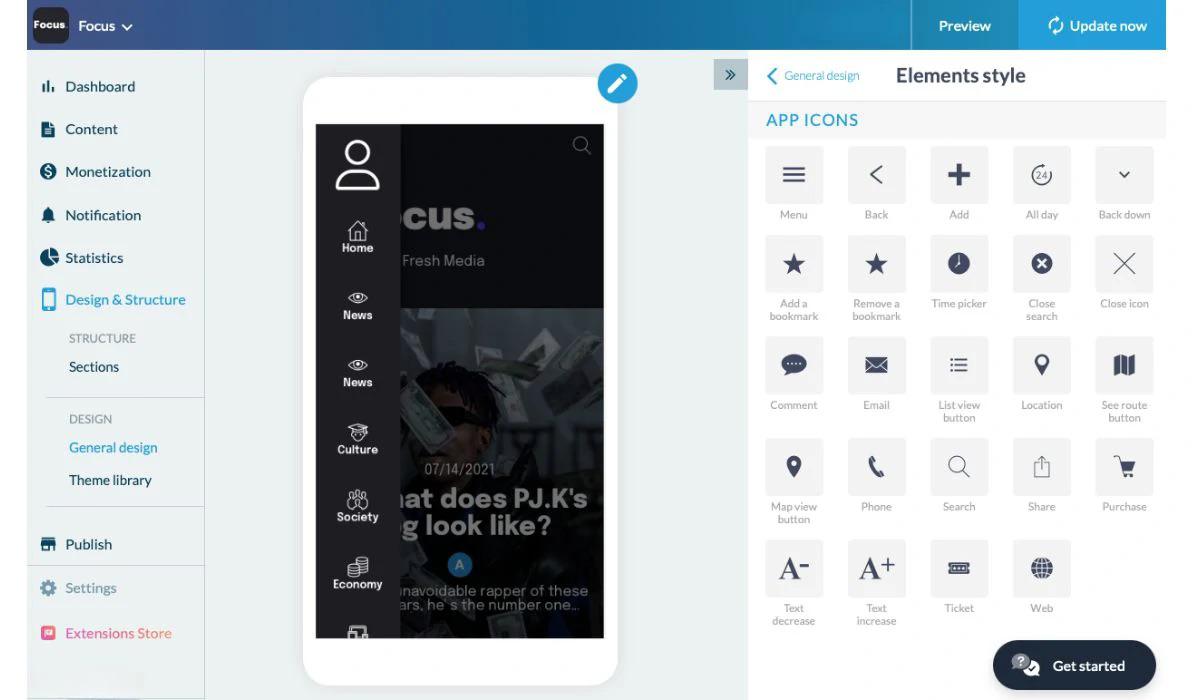 Nel menu Design generale > Stile elementi, scorrere fino alle icone dell'app.