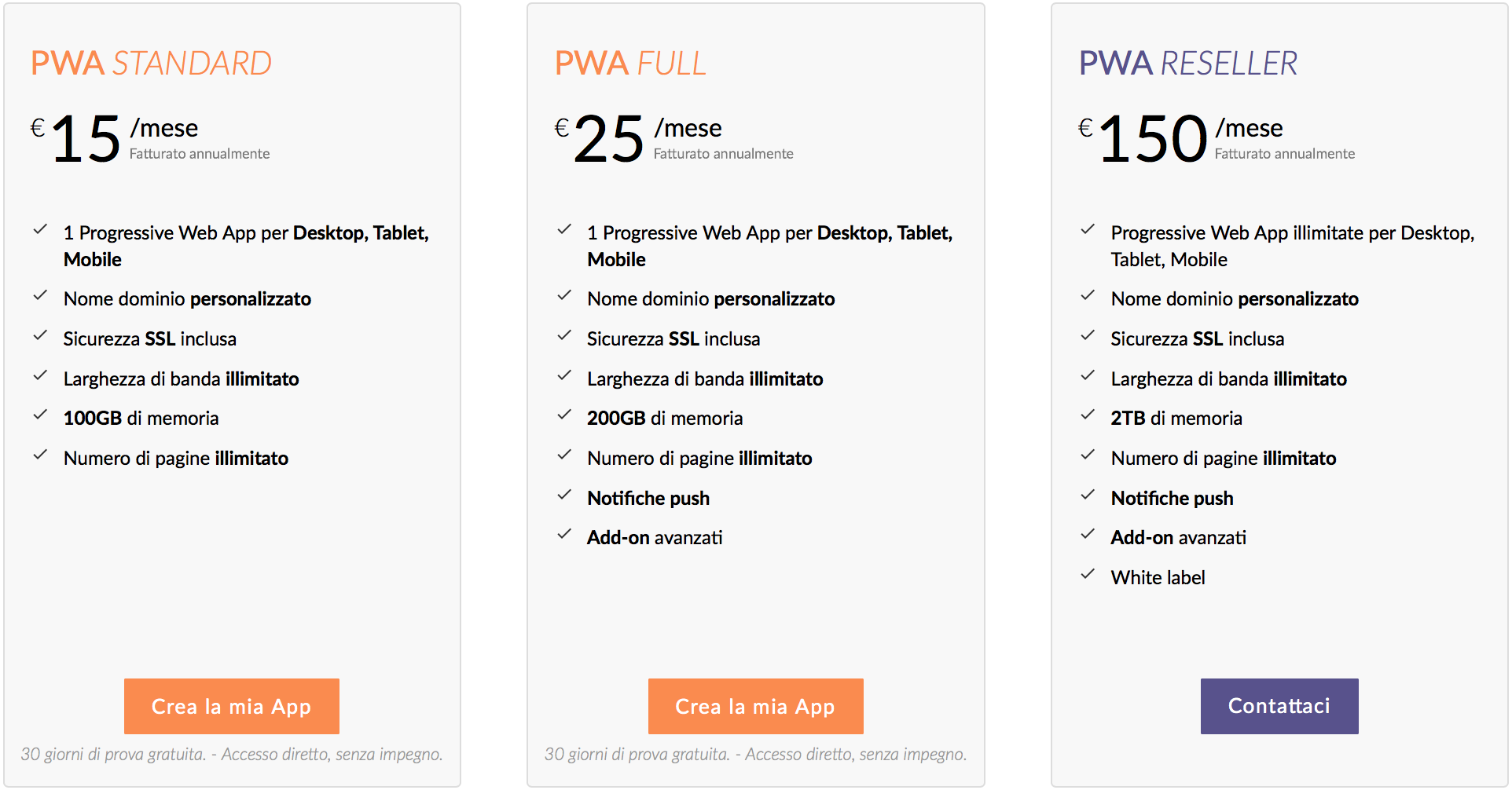 - Una per il web con 3 tipi di abbonamenti che permettono di creare Progressive Web App.