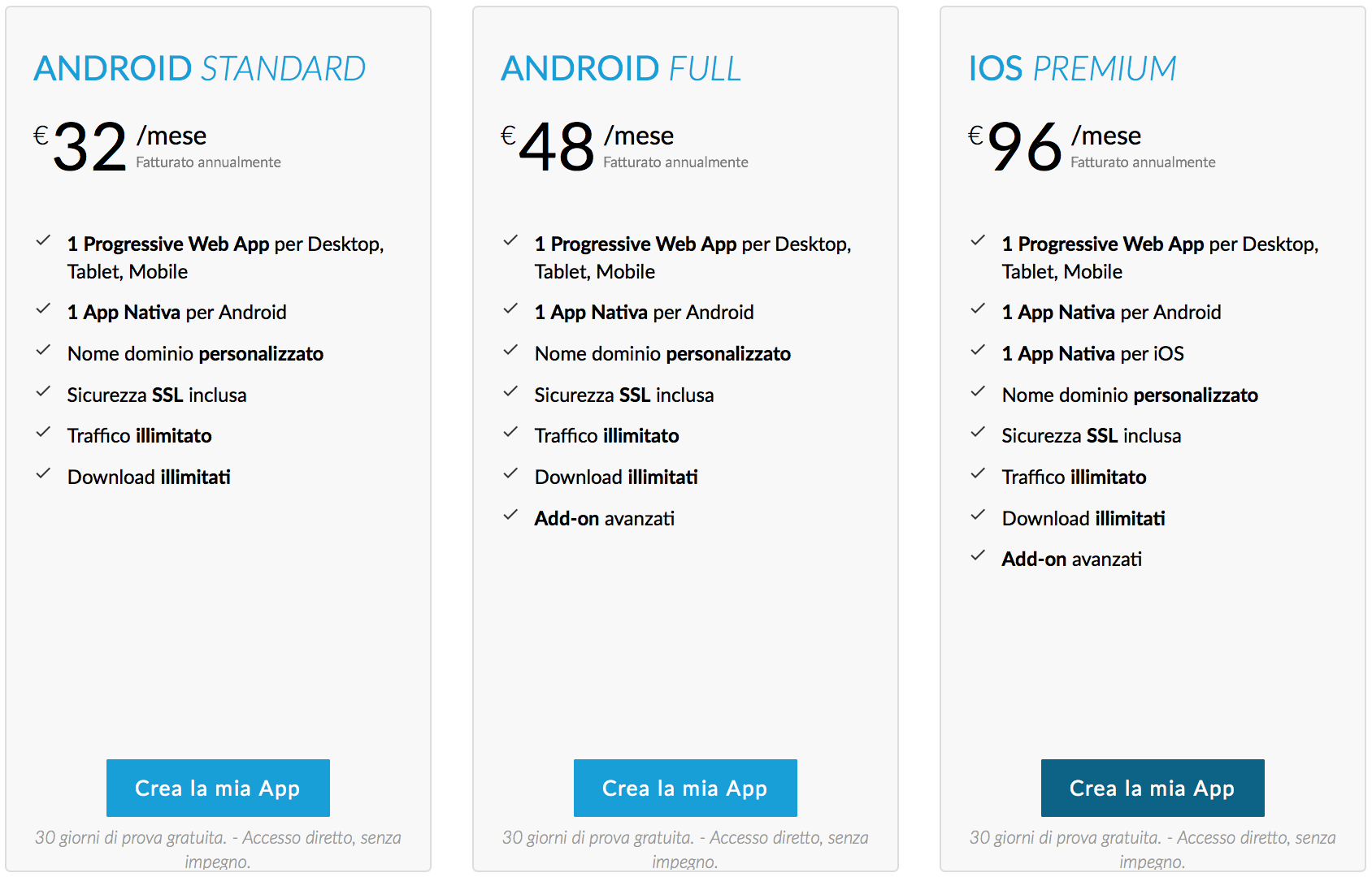 - Una nativa + web, con 4 tipi di abbonamenti per creare applicazioni native (Android + iOS) e Progressive Web App.