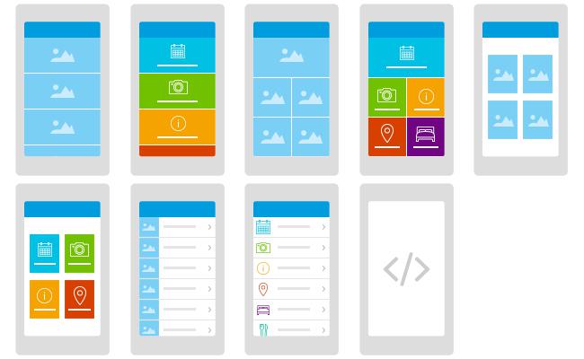Adesso dovete scegliere un modello. Ogni modello è una sorta di piattaforma da dove si può accedere alle sottosezioni che avrete inserito all'interno di questa sezione. A seconda dello stile che scegliete, potete caricare immagini d'anteprima per ogni sezione (come nell'esempio sopra), oppure potete scegliere diversi colori e icone (come nell'esempio sotto).