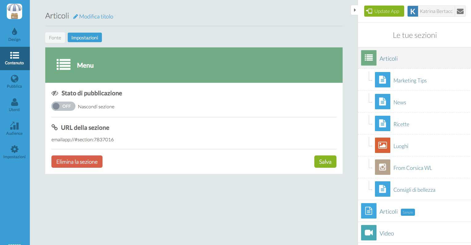 Bisogna innanzitutto aggiungere una sezione Menu all'app. Si configura esattamente come si fa per tutte le altre sezioni; dovete darle un nome e posizionarla dove volete nella lista delle sezioni.